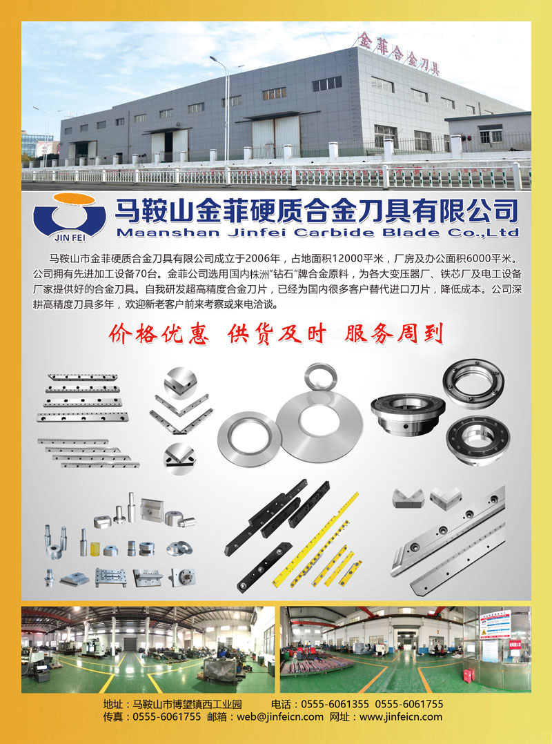 馬鞍山市金菲硬質(zhì)合金刀具有限公司成立于2006年,占地面積12000平米,廠房及辦公面積6000平米。公司擁有加工設(shè)備70臺(tái)。金菲公司選用國內(nèi)有名'鉆石"牌合金原料,為各大變壓器廠、鐵芯廠及電工設(shè)備廠家提供合金刀具。自我研發(fā)超高精度合金刀片,已經(jīng)為國內(nèi)很多客戶替代進(jìn)口刀片,降低成本。公司深耕高精度刀具多年,歡迎新老客戶前來考察或來電洽談。